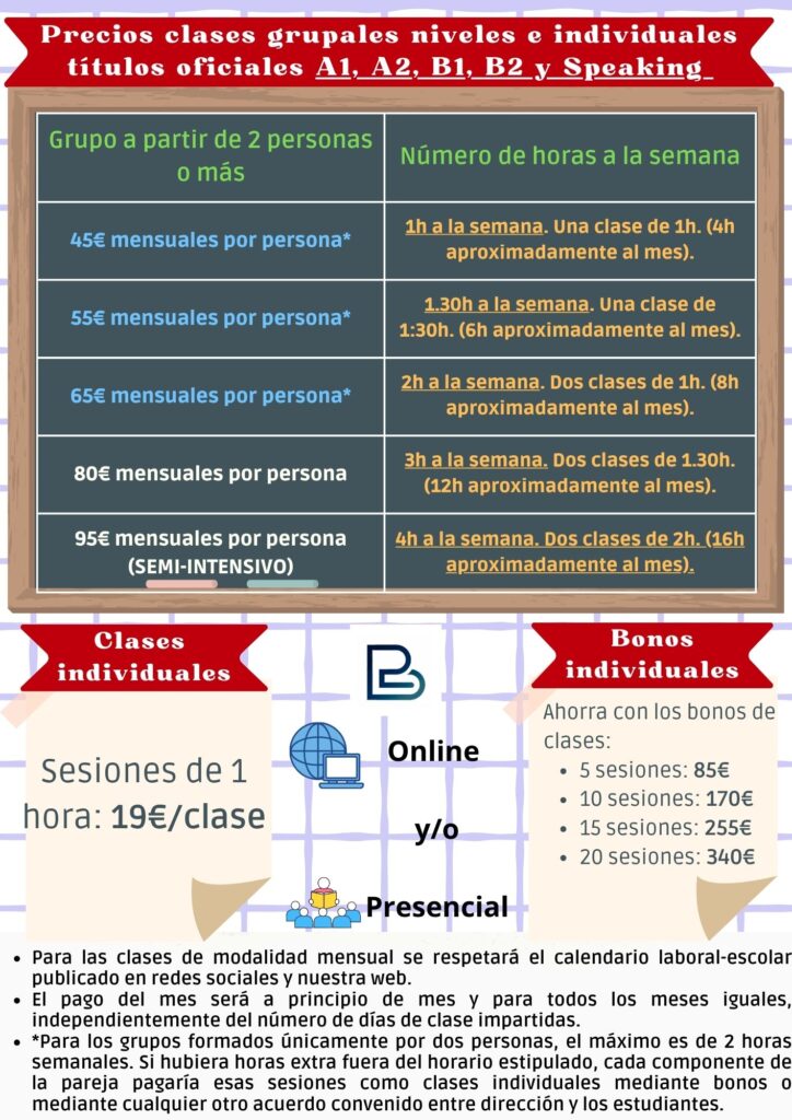 - Nuestras clases seguirán el calendario escolar/laboral correspondendiente al curso acádemico. Por lo que se respetarán los días de fiesta estipulados en dichos calendarios.