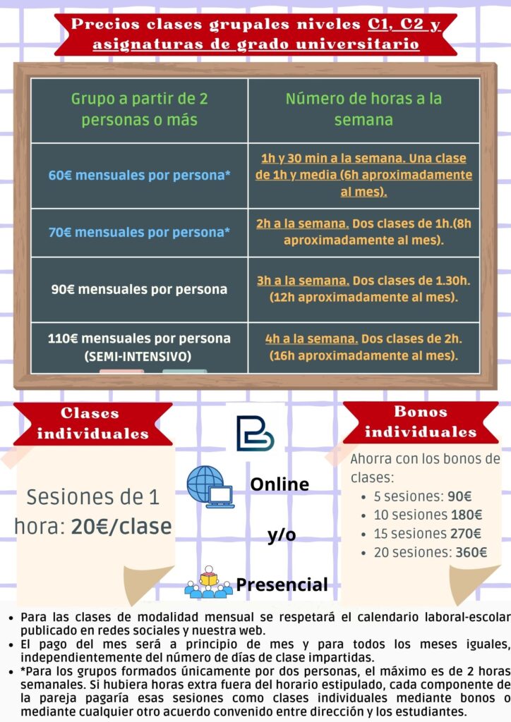 En caso del Business English in Company, es decir, en la propia empresa, existe un suplmento de 10€ en las clases grupales y de 5€ en las individuales